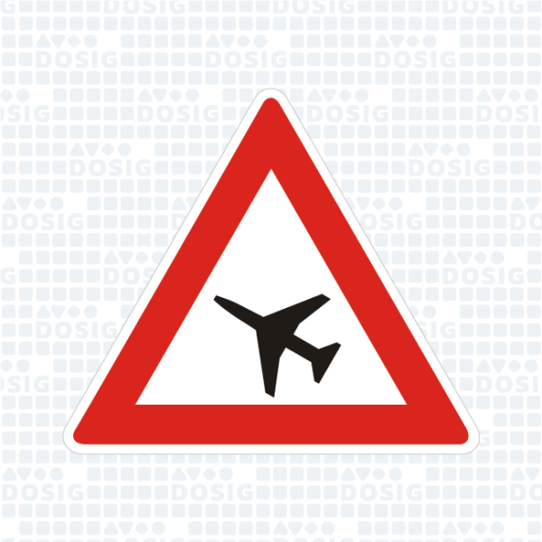 Tato dopravní značka upozorňuje na lokalitu, kde v nízké výšce nad silnicí přelétají letadla.