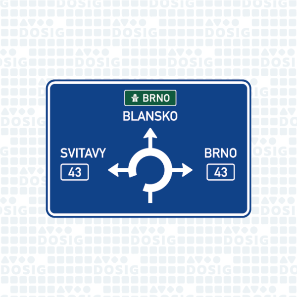 Tato dopravní značka informuje o směru k vyznačeným cílům z blížící se okružní křižovatky.