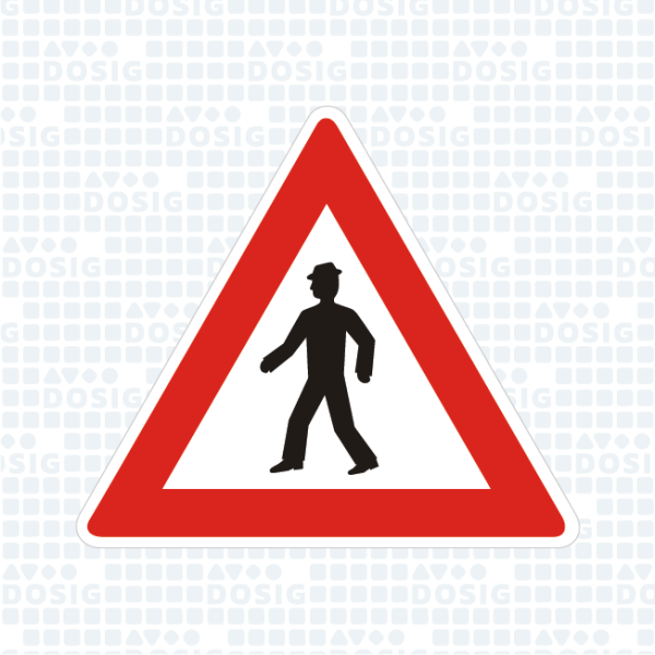 Tato dopravní značka upozorňuje na místo určené pro přecházení chodců nebo na část silnice s výrazně zvýšeným pohybem chodců podél krajnice nebo po okraji vozovky.